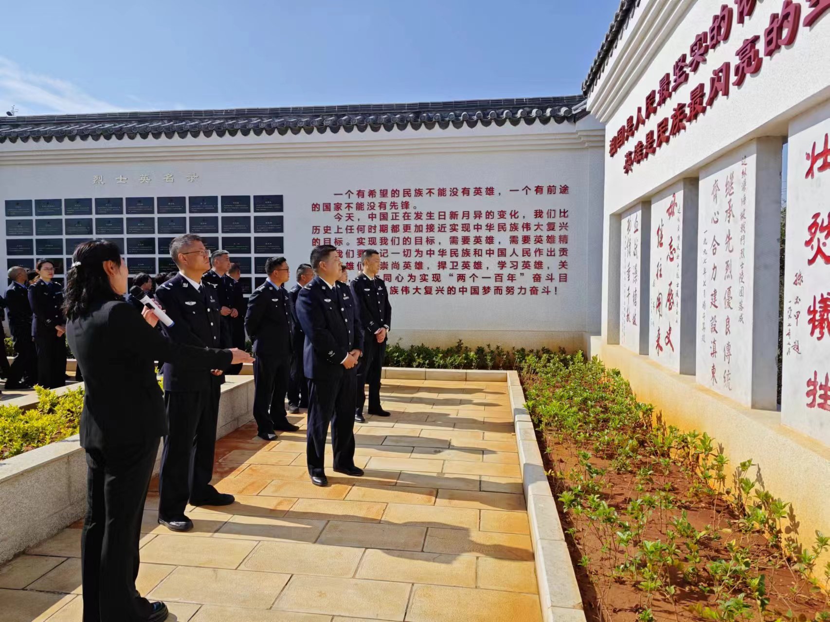 活动中,云南省曲靖监狱警察首先来到老虎山烈士陵园,大家排着整齐的队伍静静伫立,默哀致敬,行鞠躬礼,两名党员步伐铿锵,正步行进到烈士纪念碑前向革命烈士敬献花圈,曲靖监狱党委书记、监狱长缓步上前,整理花圈绶带。参加活动的人员紧绕纪念碑缓行,瞻仰烈士纪念碑,献上手中鲜花。随后,听取讲解员介绍了老虎山烈士陵园的历史背景和烈士们的英勇事迹。最后由一名监狱警察宣读祭英烈祭文。党员们对烈士们的无私奉献和坚定信仰深感敬佩,深情缅怀革命烈士的不朽功勋,表达了深深的敬意和缅怀之情。