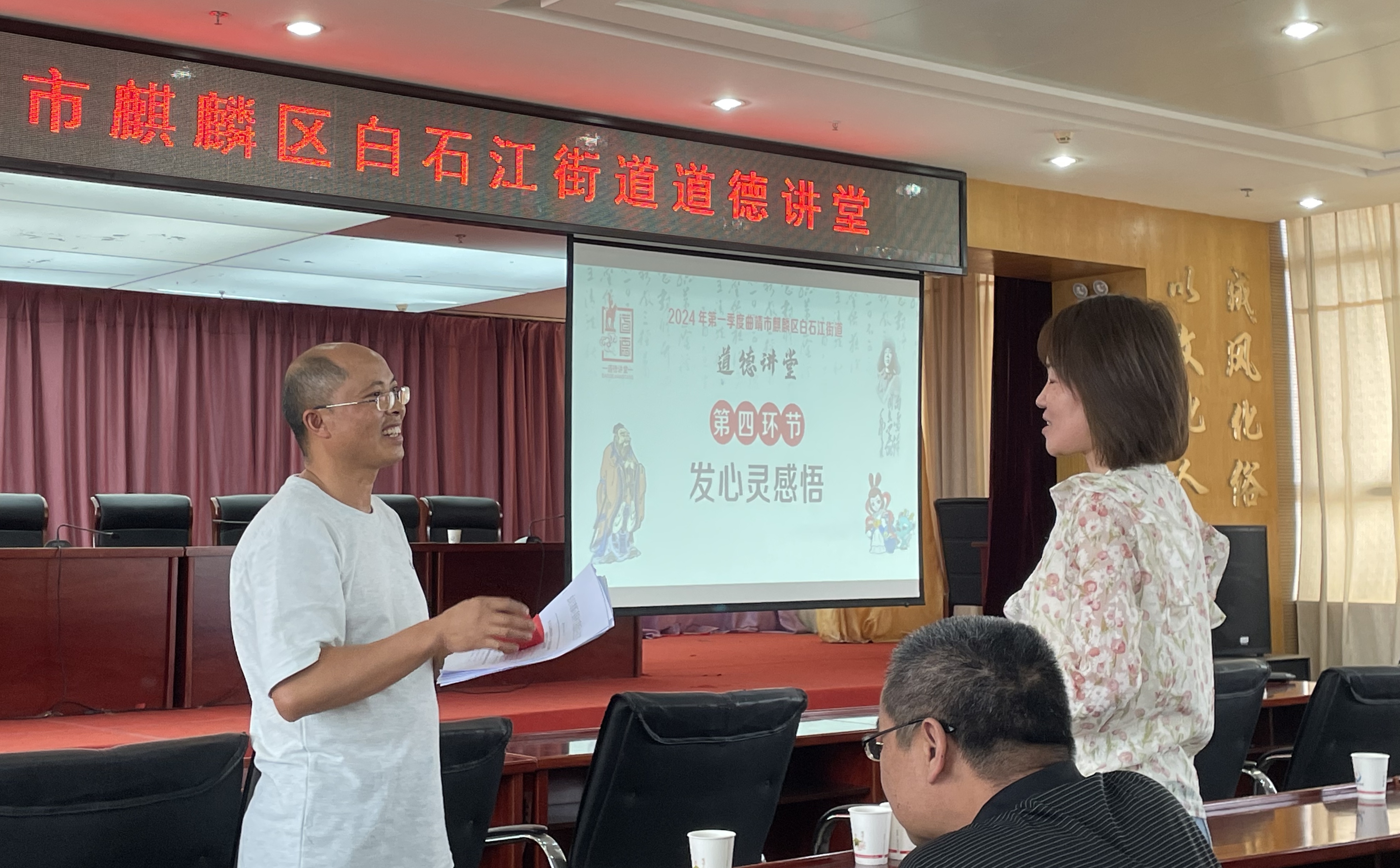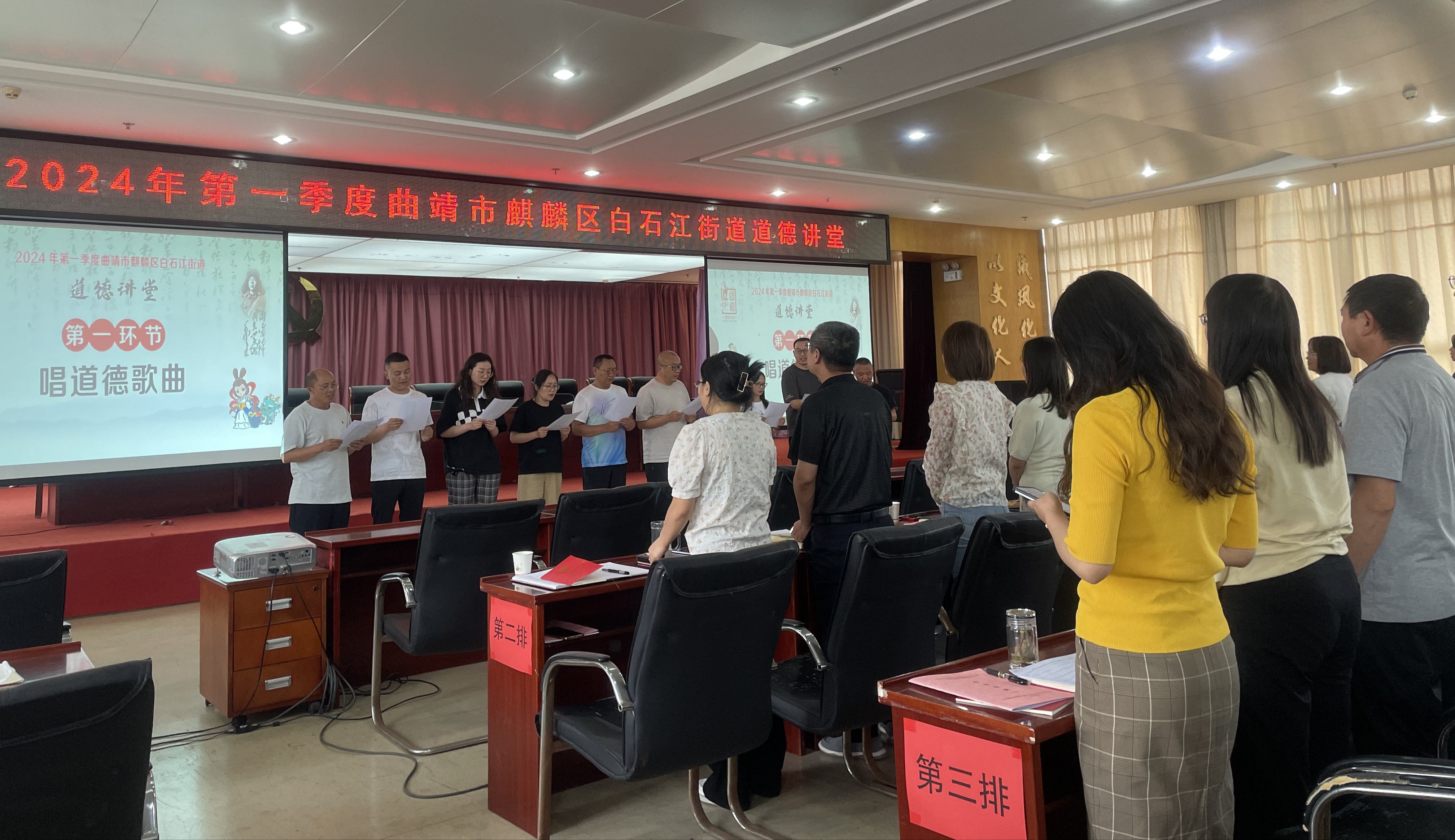近日,白石江街道开展"汲取榜样精神汇聚热血力量"为主题的道德讲堂活动,围绕"唱道德歌曲、学道德模范、诵道德经典、发心灵感悟、送平安吉祥"五个环节开展,街道机关及各社区干部职工共100余人参加。