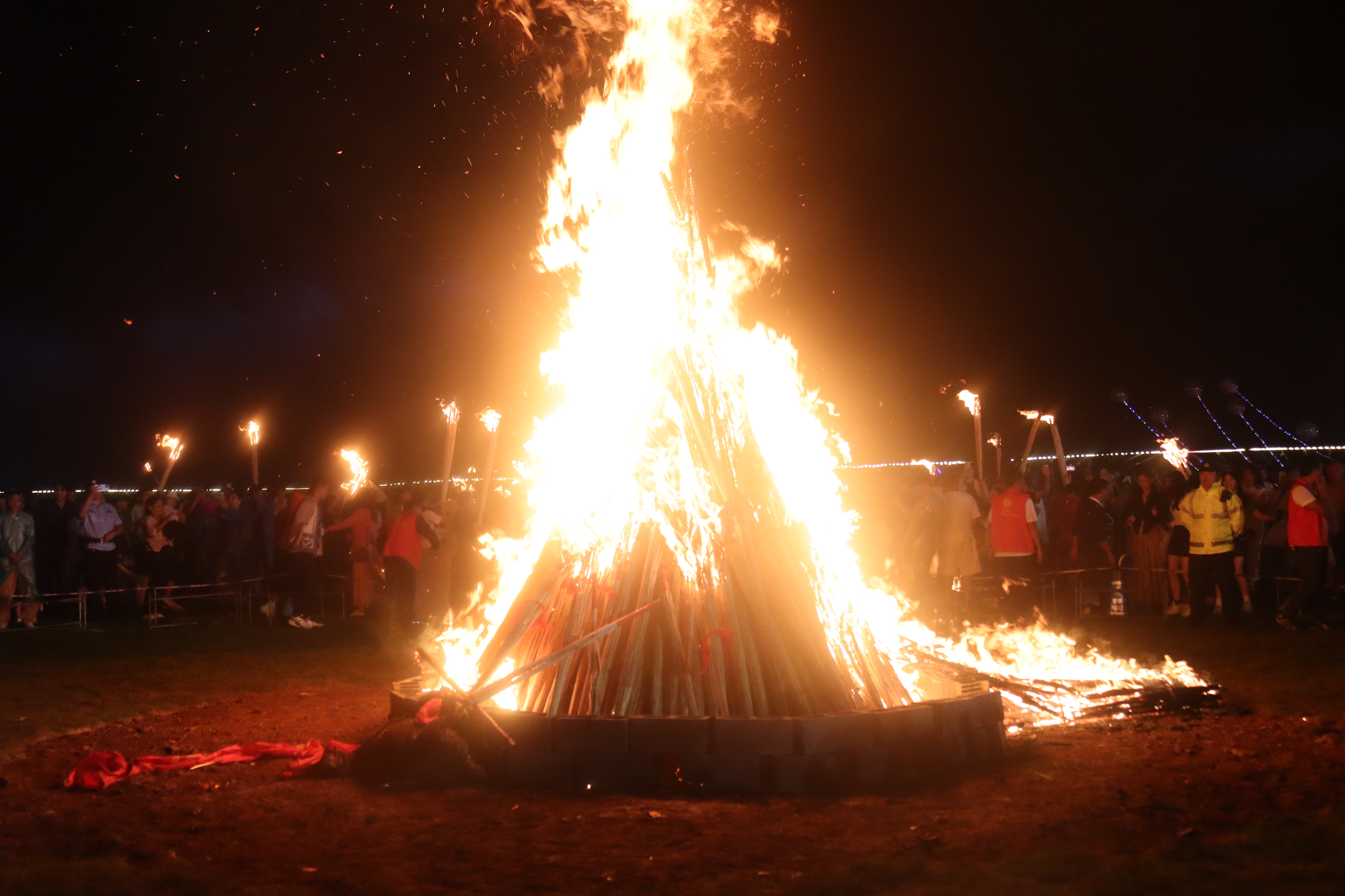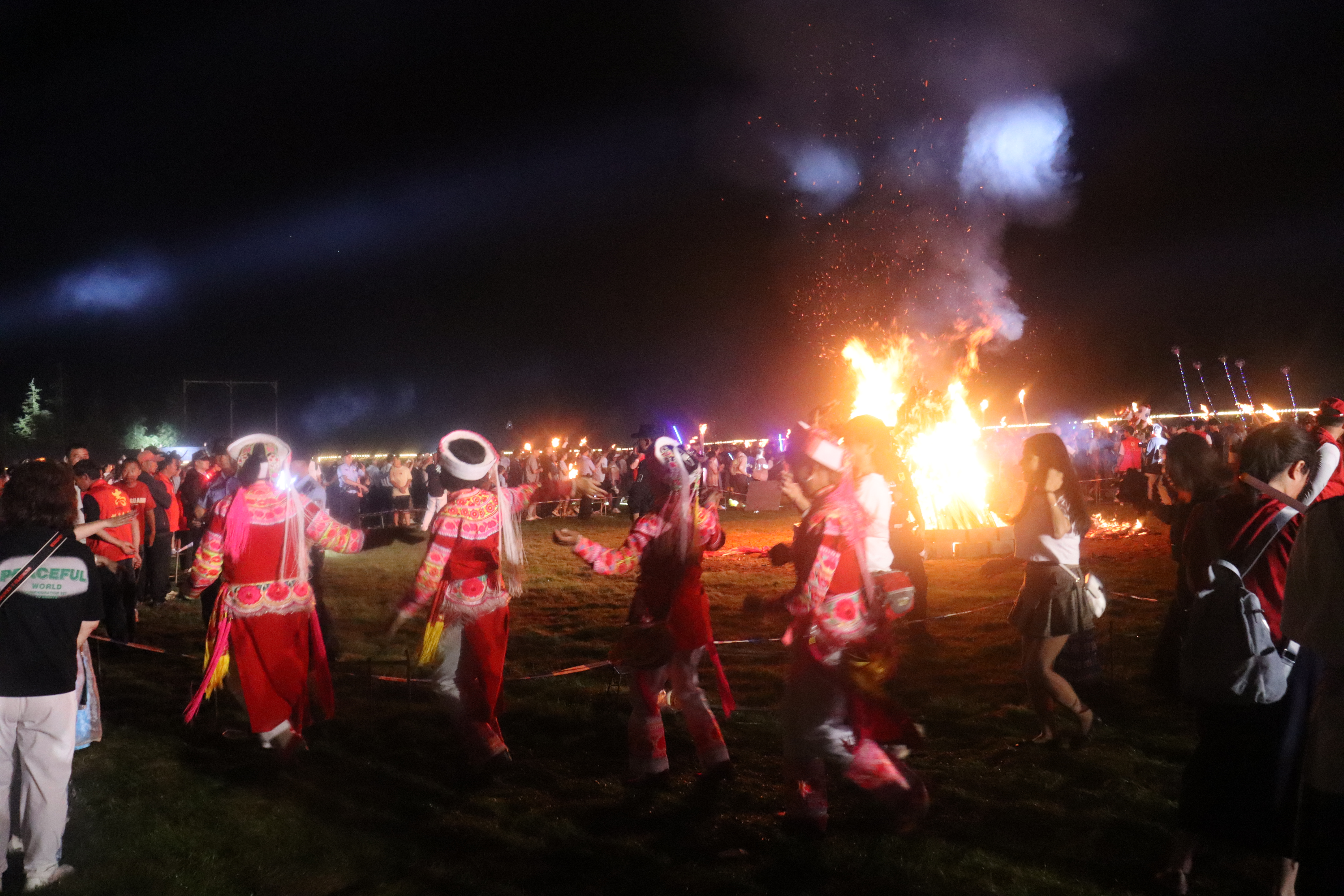 随着天幕渐落,火把节狂欢晚会和篝火晚会现场人山人海、热闹非凡,游客们亲自体验了热情豪迈的彝族酒歌,节日的气氛热烈而又神圣,人们在火光中交流、欢笑,通过舞蹈表达对美好生活的憧憬和追求,共同祈愿丰收与幸福。