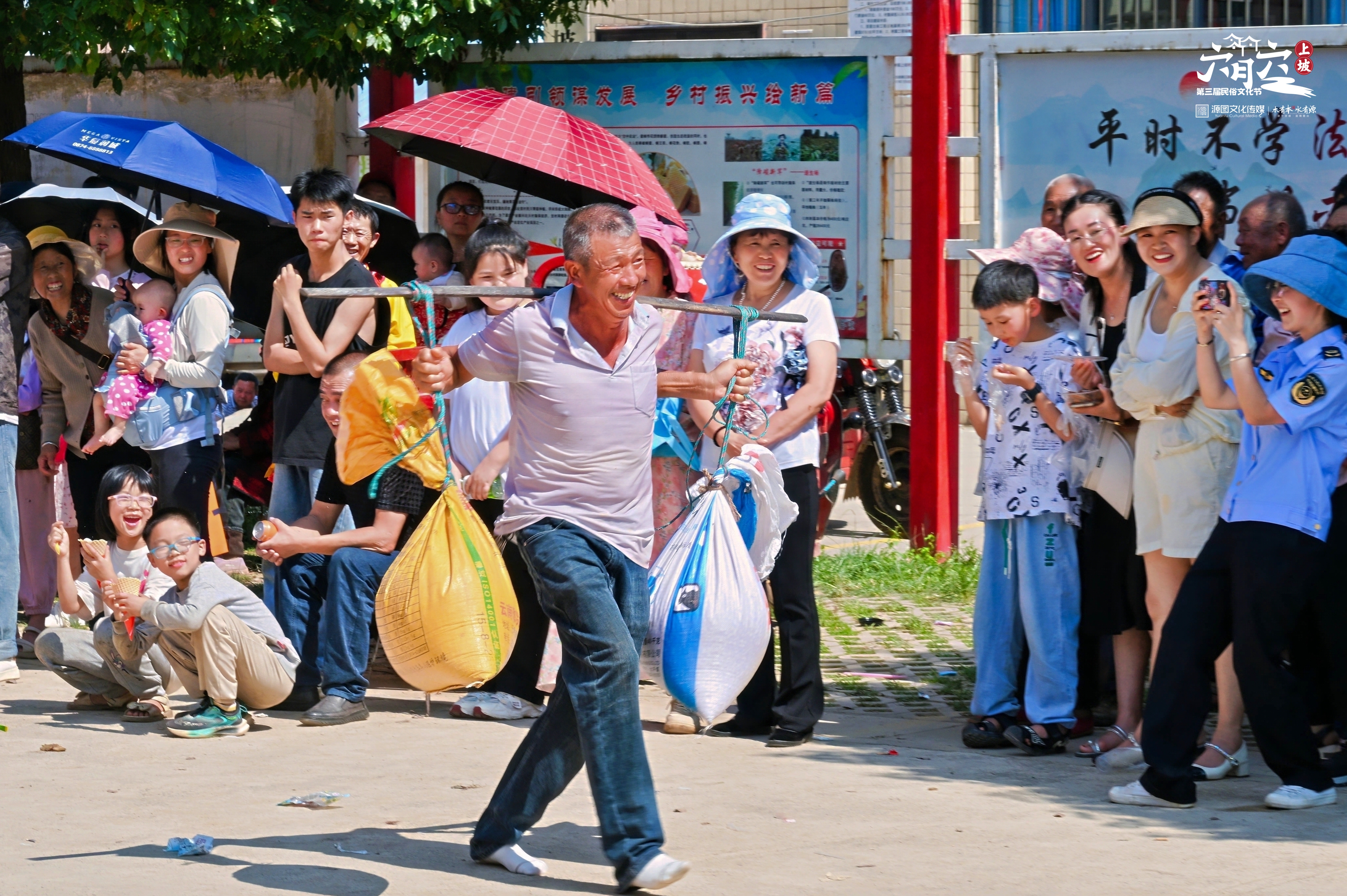 平时忙碌于田间地头的村民变身参赛选手,一场充满“农趣农味”的运动会就此展开。徒手剥毛豆粒率先开赛,一手抓豆荚,一手掐中缝,手指翻飞间,豆粒噼啪入袋!节奏熟悉而紧凑,看着一粒粒嫩绿毛豆粒脱壳而出,现场不时传出一阵阵欢呼声。“挑扁担是个体力活,还需要一点技巧来维持平衡。”参赛村民和两位队友,肩扛扁担,争分夺秒地进行接力运送。比赛过程中,选手们全神贯注,使出浑身解数,现场观众纷纷为他们加油鼓劲,气氛热烈。